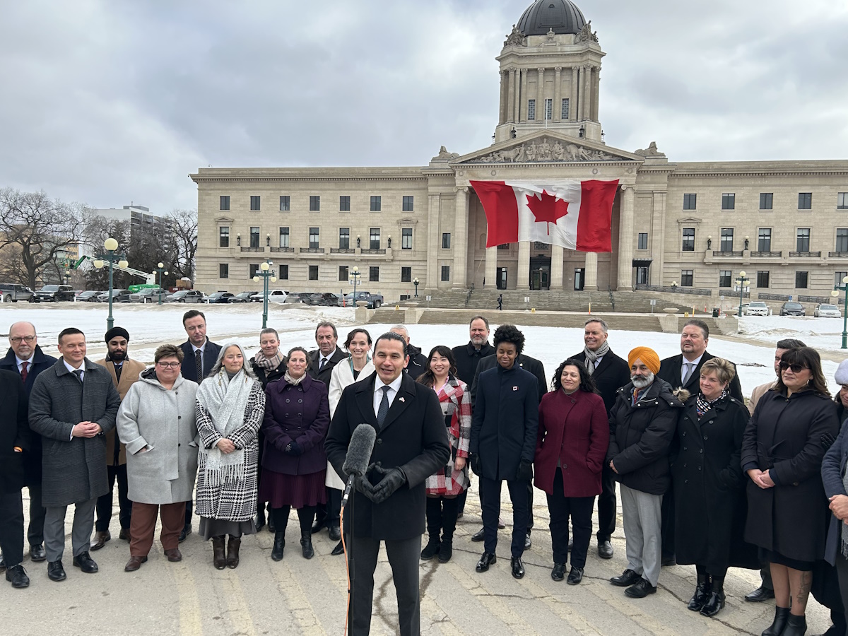 Premier Wab Kinew and members of his NDP caucus stand outside the legislative building for a press conference …