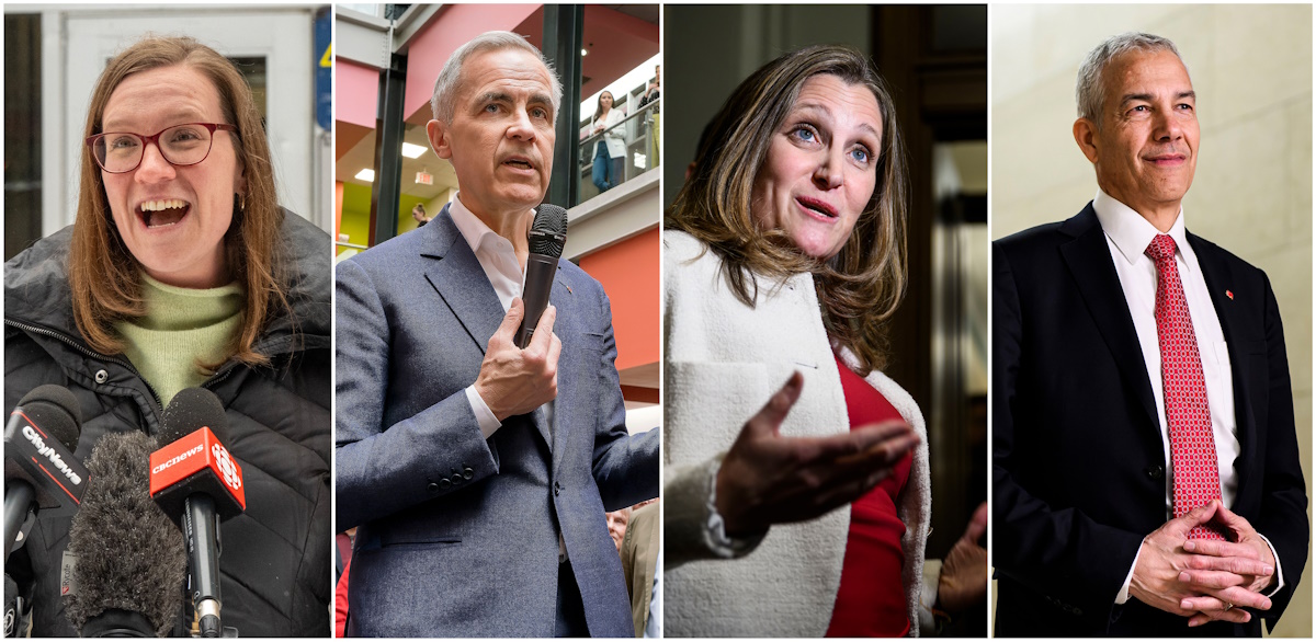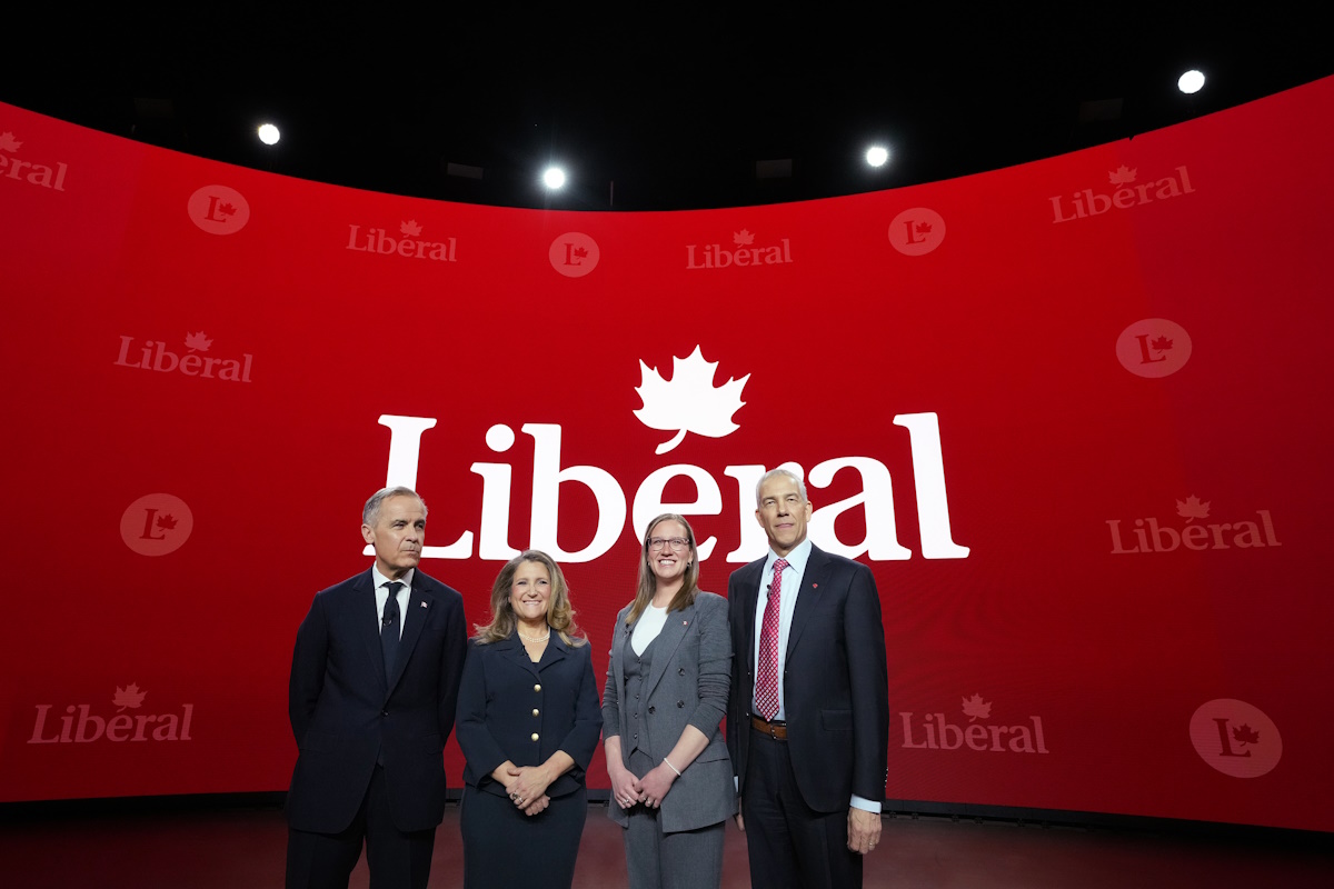 Liberal Party of Canada leadership candidates Mark Carney, Chrystia Freeland, Karina Gould and Frank Baylis pose prior to …