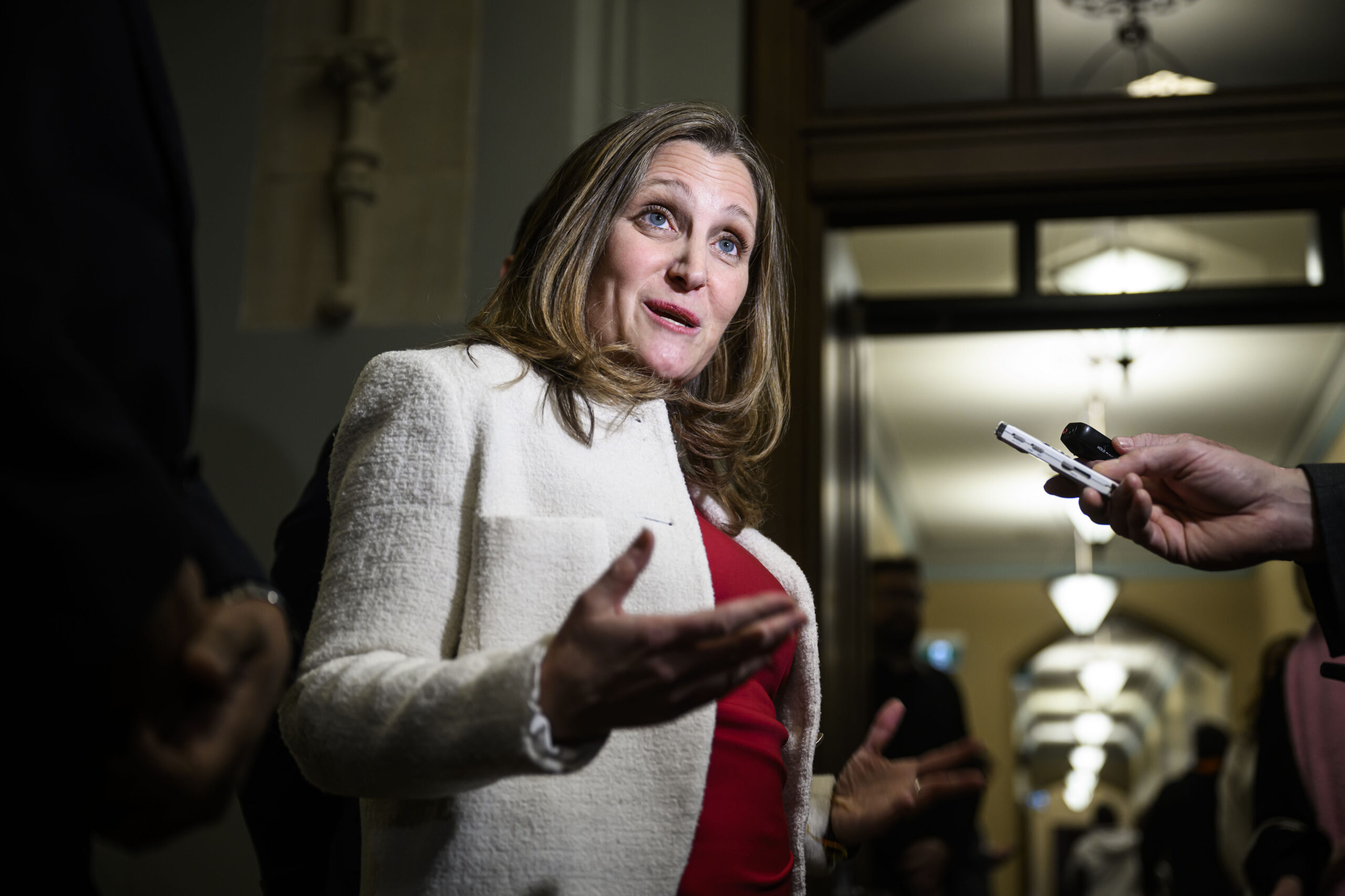 Liberal MP Chrystia Freeland answers questions from journalists in the West Block on Parliament Hill in Ottawa, on …