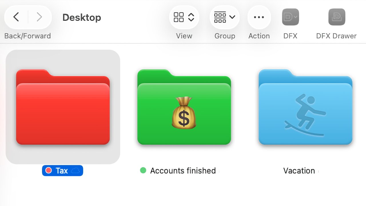 Three desktop folders: a red folder labeled Tax, a green folder with a money bag icon labeled Accounts finished, and a blue folder with a surfing icon labeled Vacation.